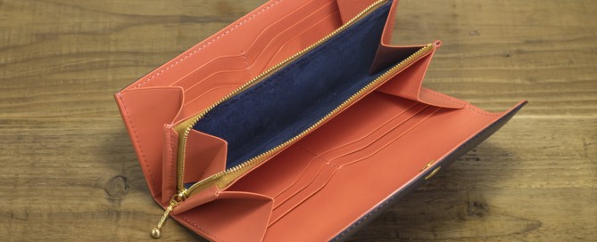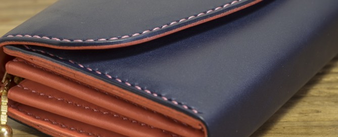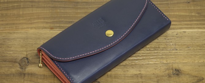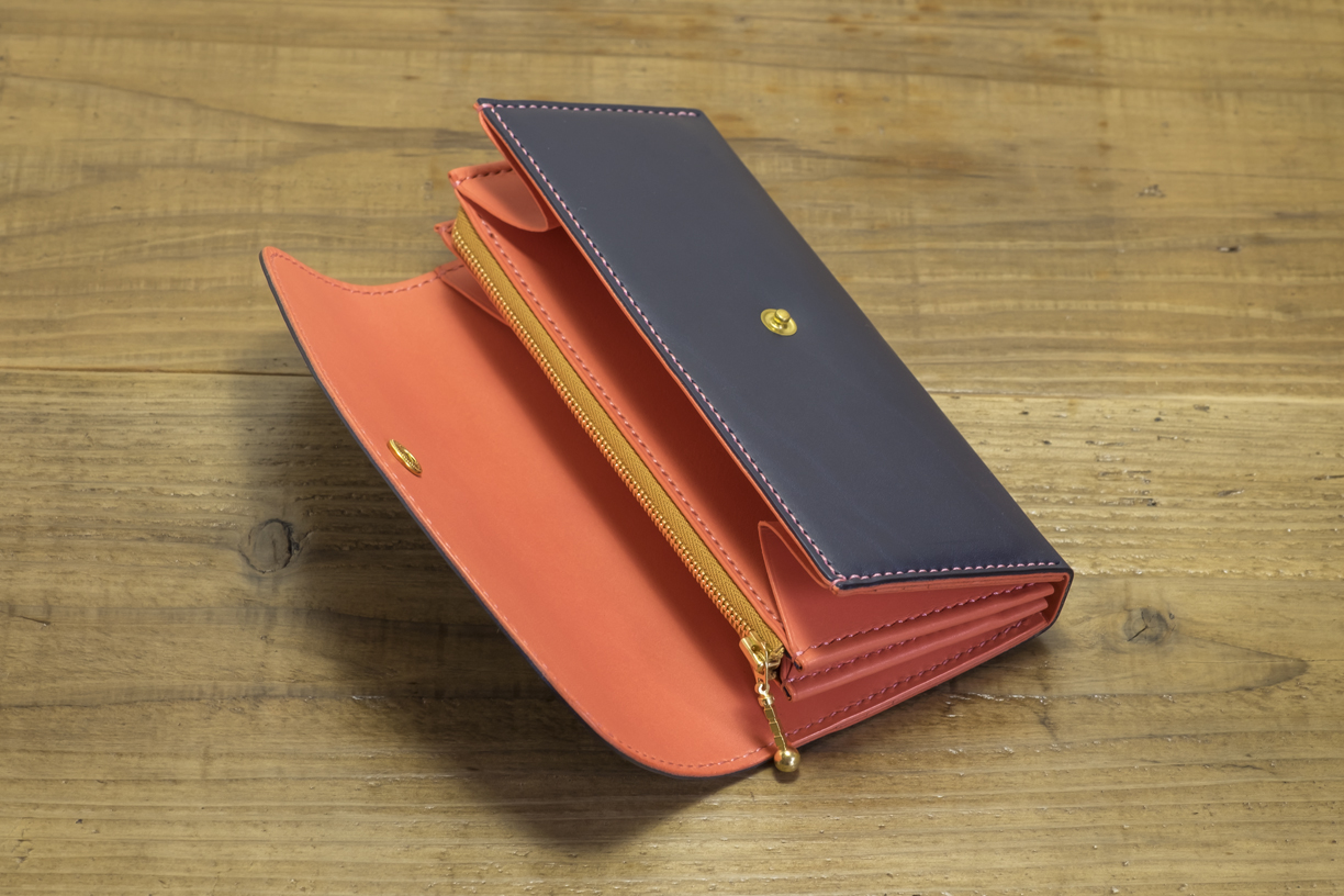 カラー/外装=ネイビー 内装・ステッチ=ピンク コインケース内装=ネイビースエード